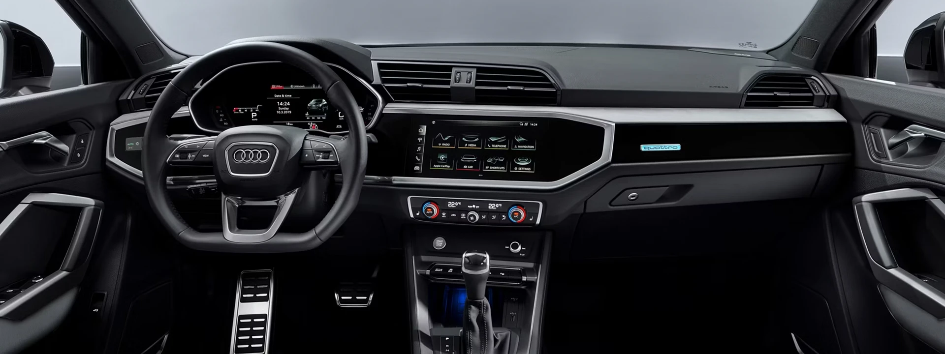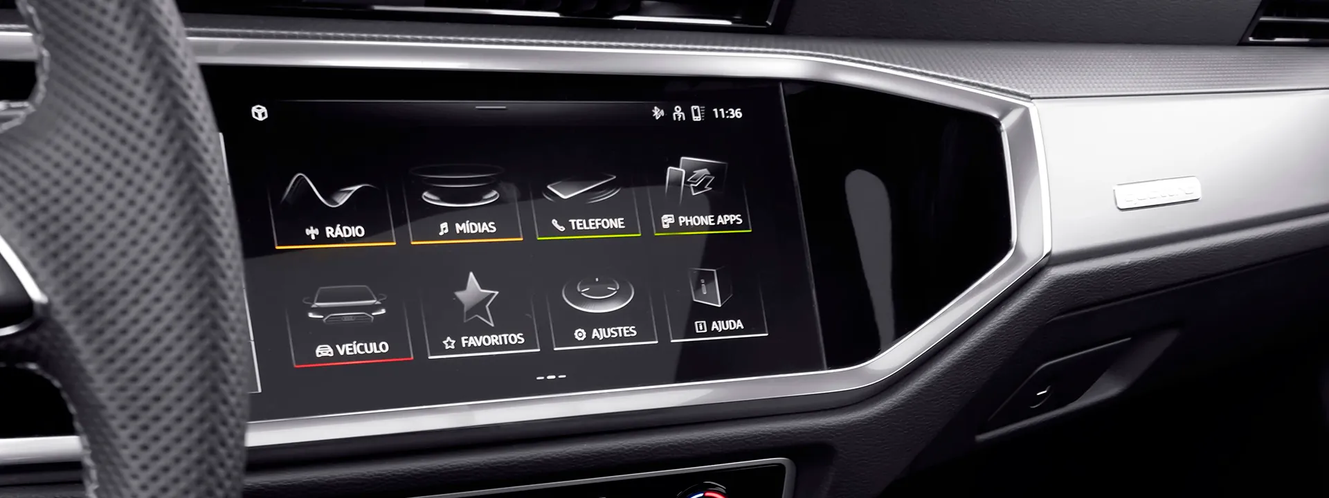 O Audi Q3 vem equipado com rádio MMI Plus de série e painel digital Virtual Cockpit de 10,25 polegadas nas versões Performance e Performance Black Plus. Várias interfaces e portas estão disponíveis para conectar seus dispositivos móveis ao veículo.